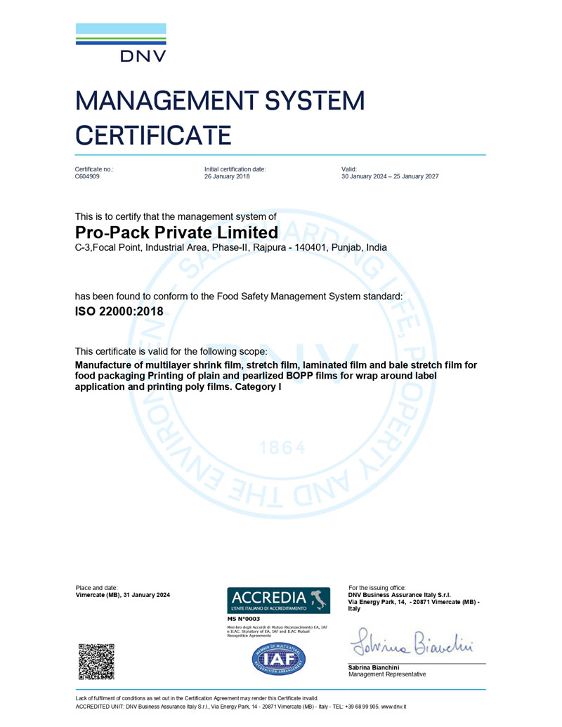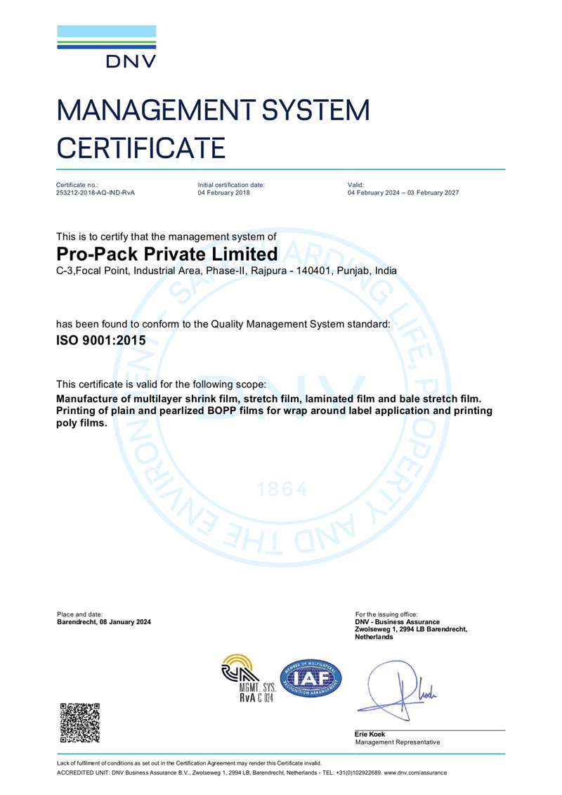 Pro-Pack Pvt Ltd, is a company which came into existence in 2014 and specializes in providing packing solutions to multiple industries. We make Shrink film, stretch film, Bopp labels, shrink sleeves and corrugated boxes, which are used in the packaging of various products. We are an ISO 22000:2005& 9001:2015 certified company.